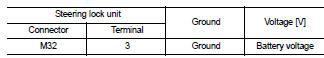 2. Check continuity between steering lock unit harness connector M32 (A) terminal 3 and ground.
