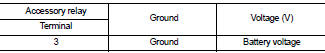3. Check voltage between accessory relay harness connector and ground under the following conditions.