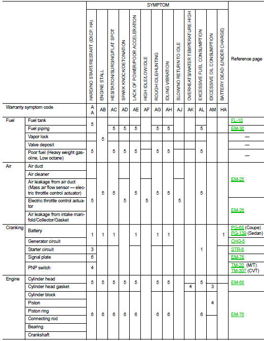 Nissan Altima (L32) 2007-2012 Service Manual: Engine control system symptoms