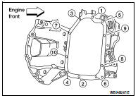 • When removing the front and rear engine through bolts and nuts, lift the engine up slightly for safety.