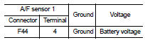 3. Check the voltage between A/F sensor 1 harness connector and ground.